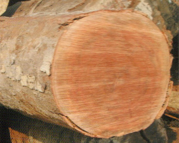 心邊材區(qū)刖路明顯、心材灰紅褐色至紅褐色。久則轉(zhuǎn)為巧克力色。邊材淺灰褐色、寬5~10cm,生長輪不明顯。