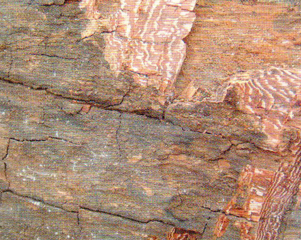 厚約0.5 cm,質(zhì)硬脆,易塊狀剝離外皮灰黑色,具不規(guī)則淺龜裂,易小片狀脫落。內(nèi)皮紫紅色,斷面見白色弦向帶、斜削面呈紫白相間的斑馬紋,為其主要的識別特征。
