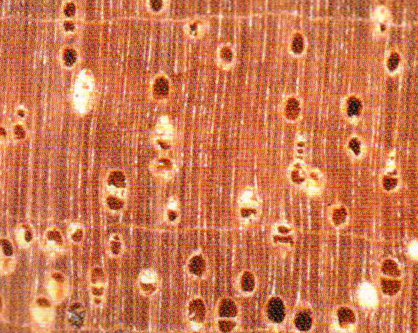 散孔材。管孔肉眼下明顯,甚少,略大;主為單管孔,少數(shù)徑列復(fù)管孔(2~3個);具白色沉積物。軸向薄壁組織放大鏡下略見,環(huán)管束狀及輪界狀。木射線放大鏡下可見,略密,甚窄。