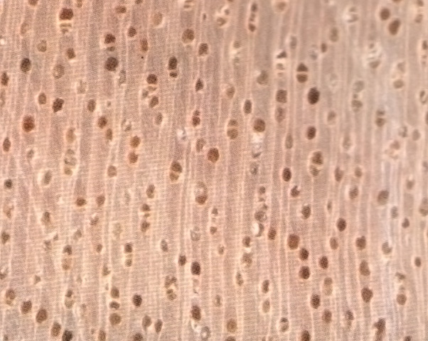 心邊材區(qū)別不明顯,心材粉紅褐色至紅褐色。邊材色稍淺、生長輪不明顯。