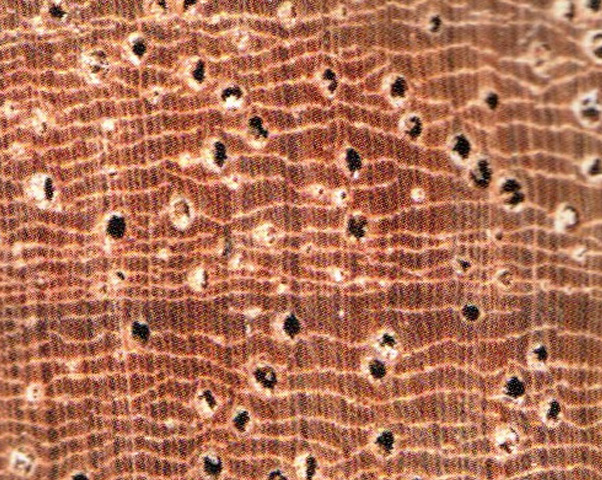 心邊材略明顯。心材暗紅褐色帶紫色調(diào),心部具不規(guī)則花紋。邊材色稍淺,寬3~4cm。生長(zhǎng)輪略明顯,輪間界以深色組織帶。