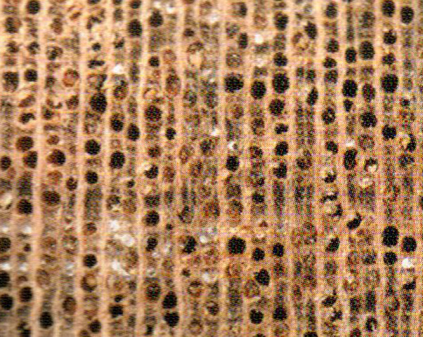 光澤弱。紋理略交錯(cuò);結(jié)構(gòu)略粗,均勻;重量、硬度、強(qiáng)度中等:干縮小。加工容易,切面光滑;含硅石,刀具易鈍:油漆、膠黏、拋光性能好; 握釘力強(qiáng)。略耐腐。干燥很慢,有開(kāi)裂、輕微翹曲、杯彎缺陷。氣干密度約0.6 g/cm3。